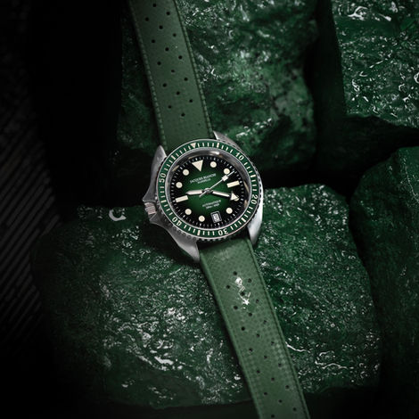 Découvrez l'innovation emblématique de notre dernière création, la JB200 Posidonie, révélant avec audace un cadran d'un vert dégradé et fumé, une première dans notre gamme. Coordonné avec raffinement, le bracelet en caoutchouc vert de type Tropic ajoute une touche de style incomparable. Cette nouveauté marque un tournant majeur pour notre maison horlogère, incarnant notre vision méditerranéenne avec assurance, légitimité et un engagement éco-responsable.